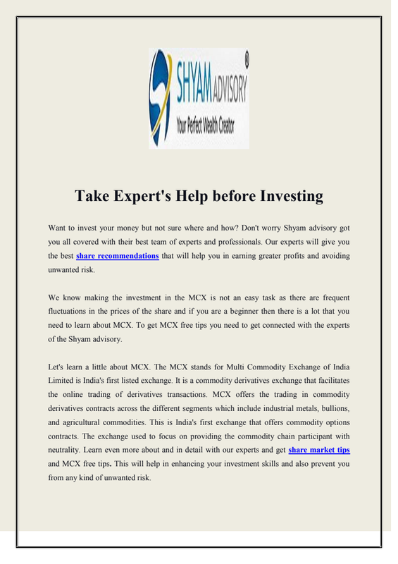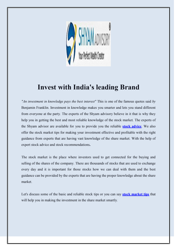 Shyam advisory is the leading share market advisory that is helping people in investing their money at the right place so that unwanted risk can be avoided and greater profits can be earned.