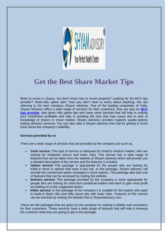 To get the MCX gold tips from the leading MCX gold tips provider that is Shyam advisory that also provides MCX free tips to their clients so that they can earn greater profits daily. We have experienced professionals that have full knowledge of the share market so that they can properly analyze the market and give the most accurate advice.
