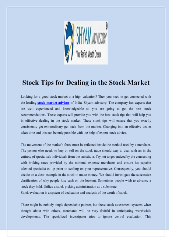 Looking for a good stock market at a high valuation? Then you need to get connected with the leading stock market advisor of India, Shyam advisory. The company has experts that are well experienced and knowledgeable so you are going to get the best stock recommendations. These experts will provide you with the best stock tips that will help you in effective dealing in the stock market. These stock tips will ensure that you exactly consistently get extraordinary get back from the market. Changing into an effective dealer takes time and this can be only possible with the help of expert stock advice.