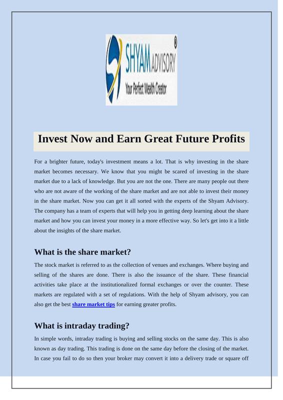 Intrigued merchants utilizing terminals given by their representatives exchange on those offers. To learn more about the share market and get the best Share tips then you need to visit the website of Shyam advisory.